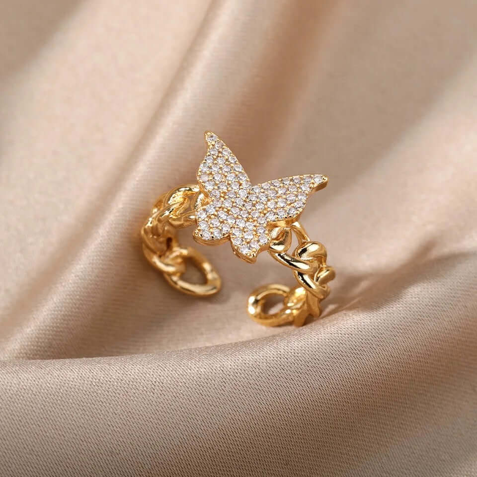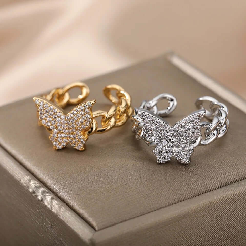 Elevate your look with this Crystal Butterfly Chain Link Ring, a perfect fusion of elegance and edge. Featuring a dazzling butterfly design encrusted with shimmering cubic zirconia crystals, this adjustable ring is crafted with a bold chain link band for a statement finish. Whether in gold or silver, this butterfly ring adds a touch of glam to any outfit. Ideal for those who love butterfly jewelry, stackable rings, or trendy statement rings, it’s a must-have for your jewelry collection. Lightweight yet eye-catching, it’s perfect for daily wear or special occasions.