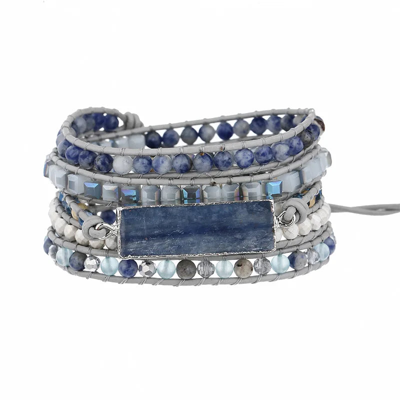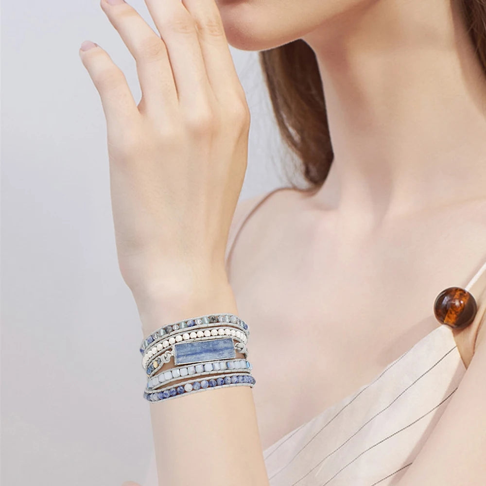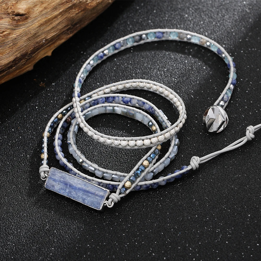 Elevate your energy with this Kyanite Stone Beaded Wrap Bracelet, crafted to harmonize your aura and support emotional clarity. Featuring natural kyanite crystals, luminous blue gemstone beads, and handwoven detailing, this wrap bracelet radiates serene coastal vibes. The healing properties of kyanite are known to encourage balance, tranquility, and inner peace. Designed for versatility and comfort, it’s the perfect boho bracelet for women who love meaningful, artisan-crafted accessories. Stack it or wear it solo—this natural stone bracelet brings grounding style to any look.