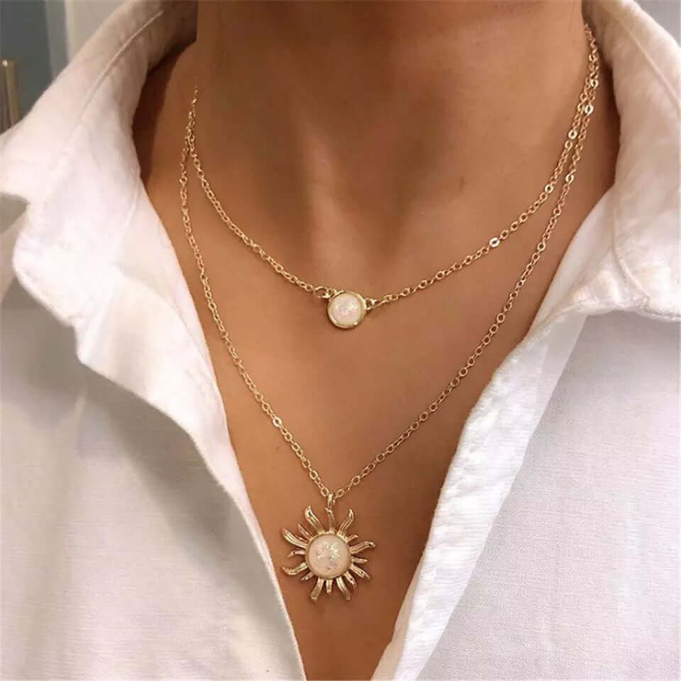 Radiate effortless boho‑chic with this Layered Pink Opal Sun Necklace—a double‑strand statement that fuses celestial charm with modern minimalism. The upper chain showcases a luminous pink opal choker pendant, while the longer strand features a striking sunburst medallion encircling a blush opal cabochon. This lightweight, hypoallergenic necklace is perfect for festival outfits, beachwear, or everyday layering jewelry. Adjustable from collarbone to décolletage, it’s an ideal gift for lovers of opal necklaces, sun jewelry, layered chains, and spiritual healing crystals—pair it with plunging necklines or cozy knits for year‑round glow.