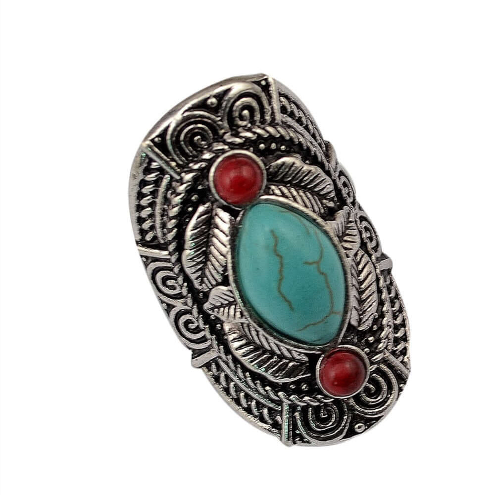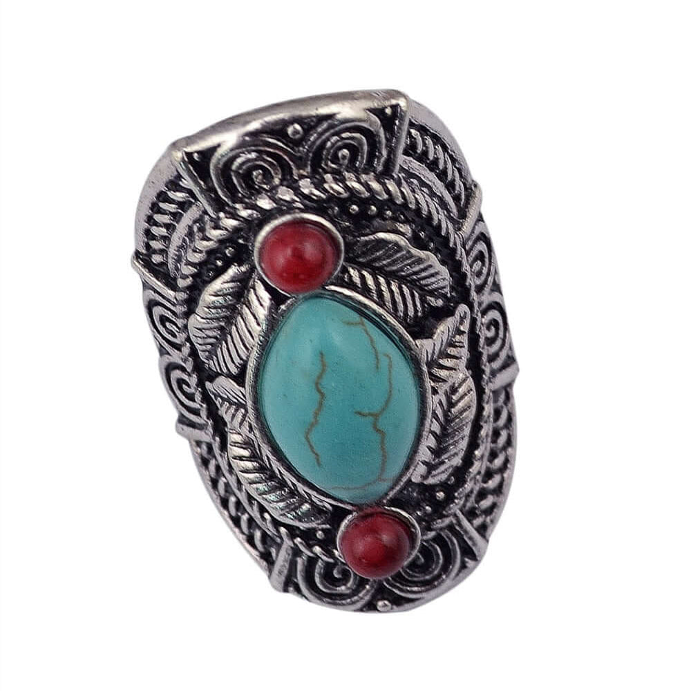 Elevate your statement style with this Red Jasper Turquoise Tribal Ring, a bold fusion of boho fashion and vintage southwestern jewelry. Featuring a striking oval turquoise gemstone, flanked by vibrant red jasper accents, this oversized ring is framed in intricately engraved antique silver-tone metalwork inspired by Native American designs. Ideal for lovers of turquoise rings, tribal statement jewelry, and bohemian accessories, it’s perfect for festivals, everyday flair, or unique gifting. The adjustable band ensures a comfortable fit, making it a versatile and unforgettable piece in any jewelry collection.